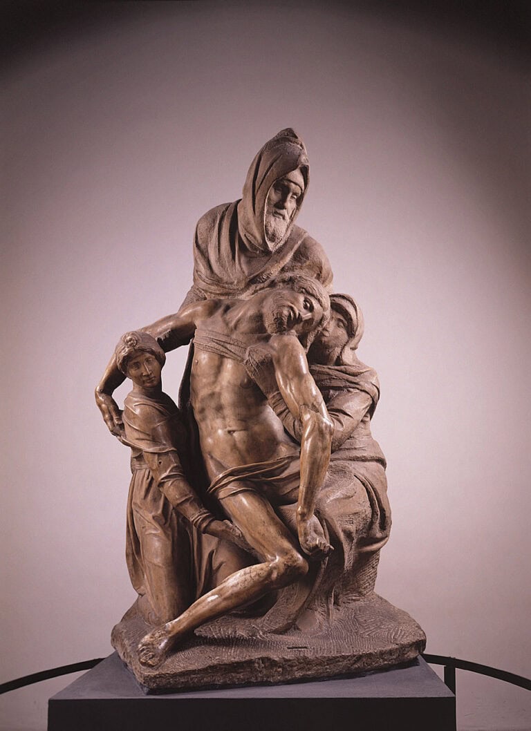La escultura de Miguel Ángel aquí representada nos muestra a Nicodemo mientras, con María y Magdalena, desciende de la cruz el cuerpo de Cristo: el escultor se identifica con él, dándole sus propios rasgos.