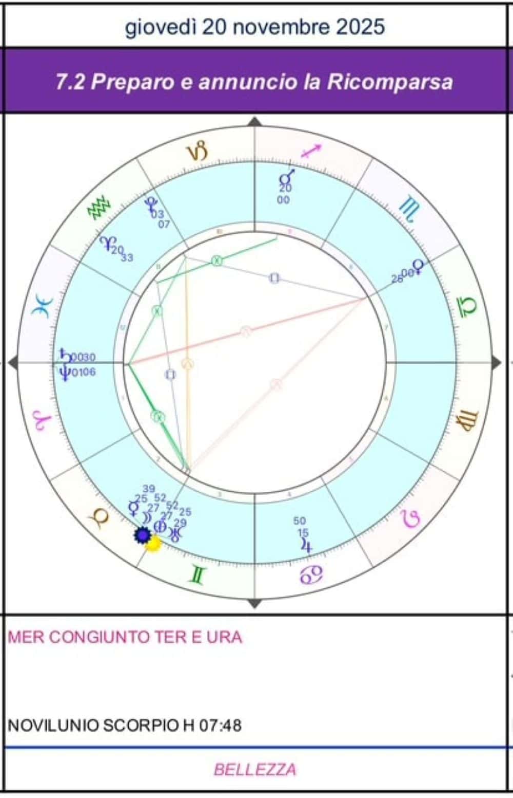 Hoy, en la partitura sonora del Sistema Solar, la eclíptica, resplandece la Luz de la Belleza encendida por la síntesis energética del alineamiento Sol-Mercurio-Tierra en el eje zodiacal Escorpio-Tauro, que transmite el puro cuarto Rayo, el Signo portador de Belleza y Armonía, que la humanidad está llamada a realizar en toda Su potencia y gracia, como se indica en el Tratado de Magia Blanca de Alice A. Bailey, pág. ing. 289. «Cuarto rayo. Que la gloria exterior desaparezca y la belleza de la Luz interior revele al Uno. Que la disonancia dé paso a la armonía y que desde el centro de la Luz oculta hable el alma. Que se proclame en voz alta: La Belleza y la Gloria no me velan. Permanezco revelada. Yo soy.»